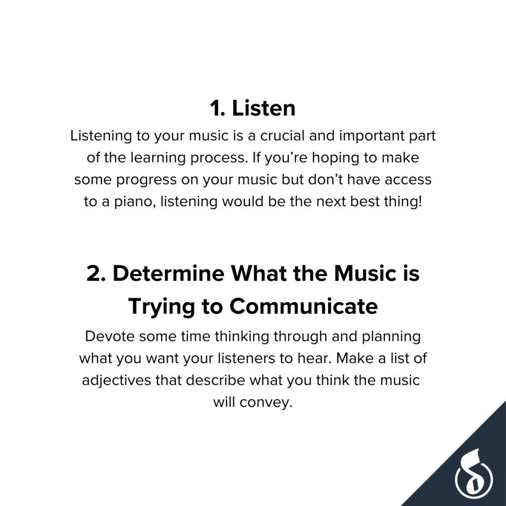 These tips I found at MusicNotes.com Facebook page. If you’re not familiar with MusicNotes.com, I encourage you to check it out. It is a great resource to finding the perfect sheet music to use in your lessons at just the right level of playing for you. Below you’ll see what tips they offer to help you practice more effectively, with or without your keyboard. Listening to your music and studying it before you play are great tips when learning any new piece. Don’t forget you can jot down any special notes or reminders to yourself in the music too!