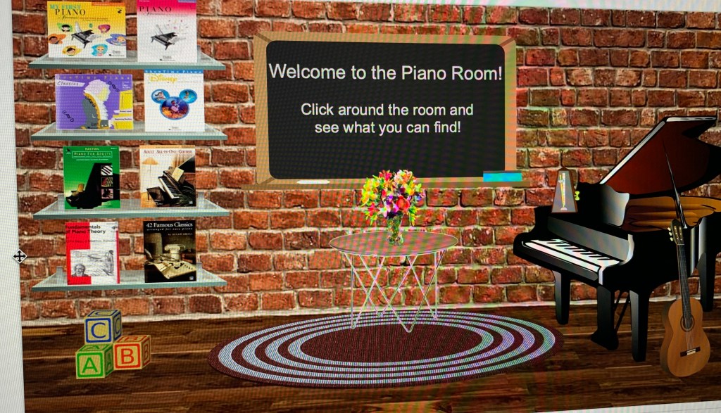 To go along with my last post about virtual classrooms, I hope you’ve been able to check out my general music classroom and have had some fun. Now it’s time for more fun in the Piano Room!
