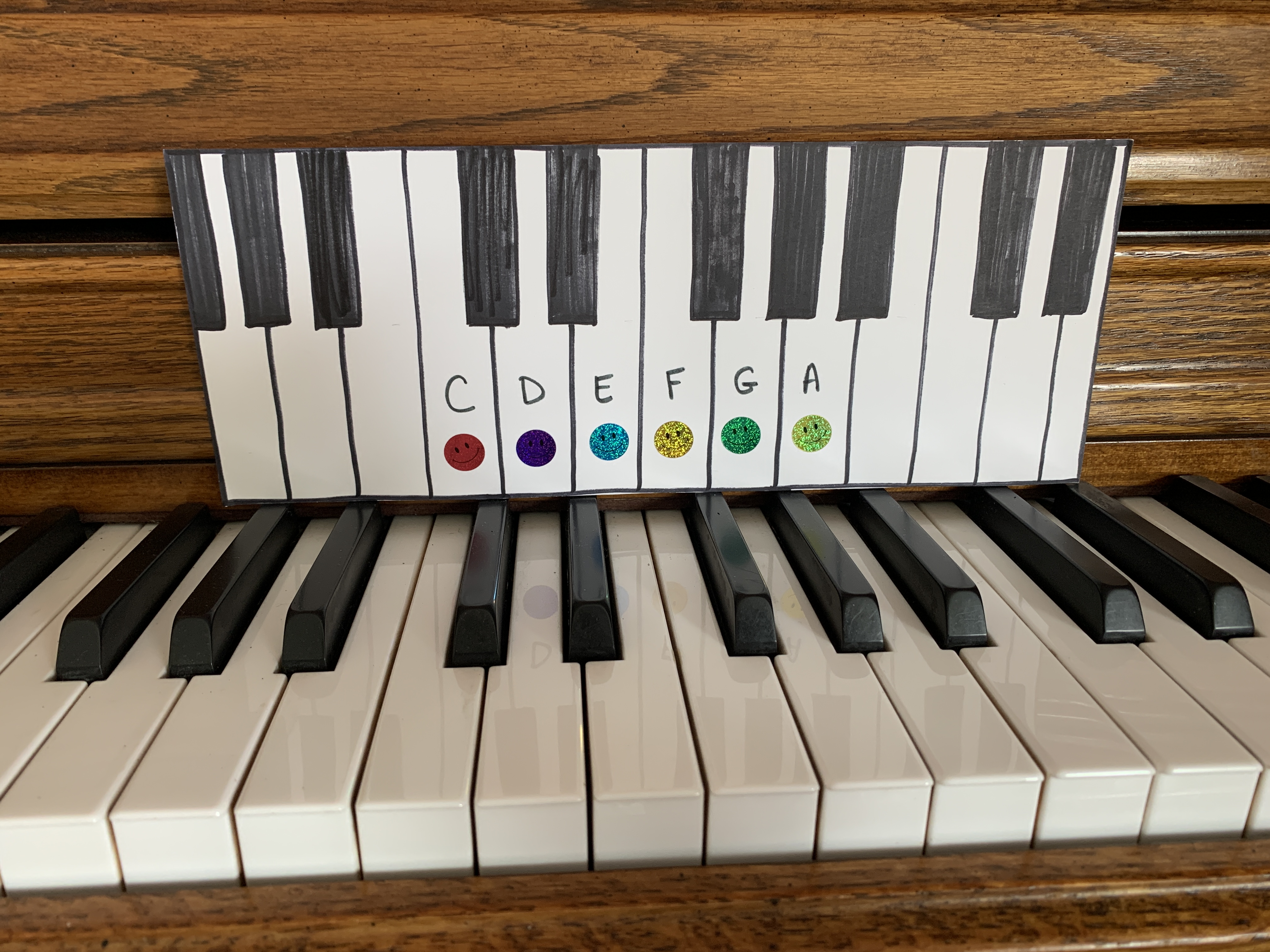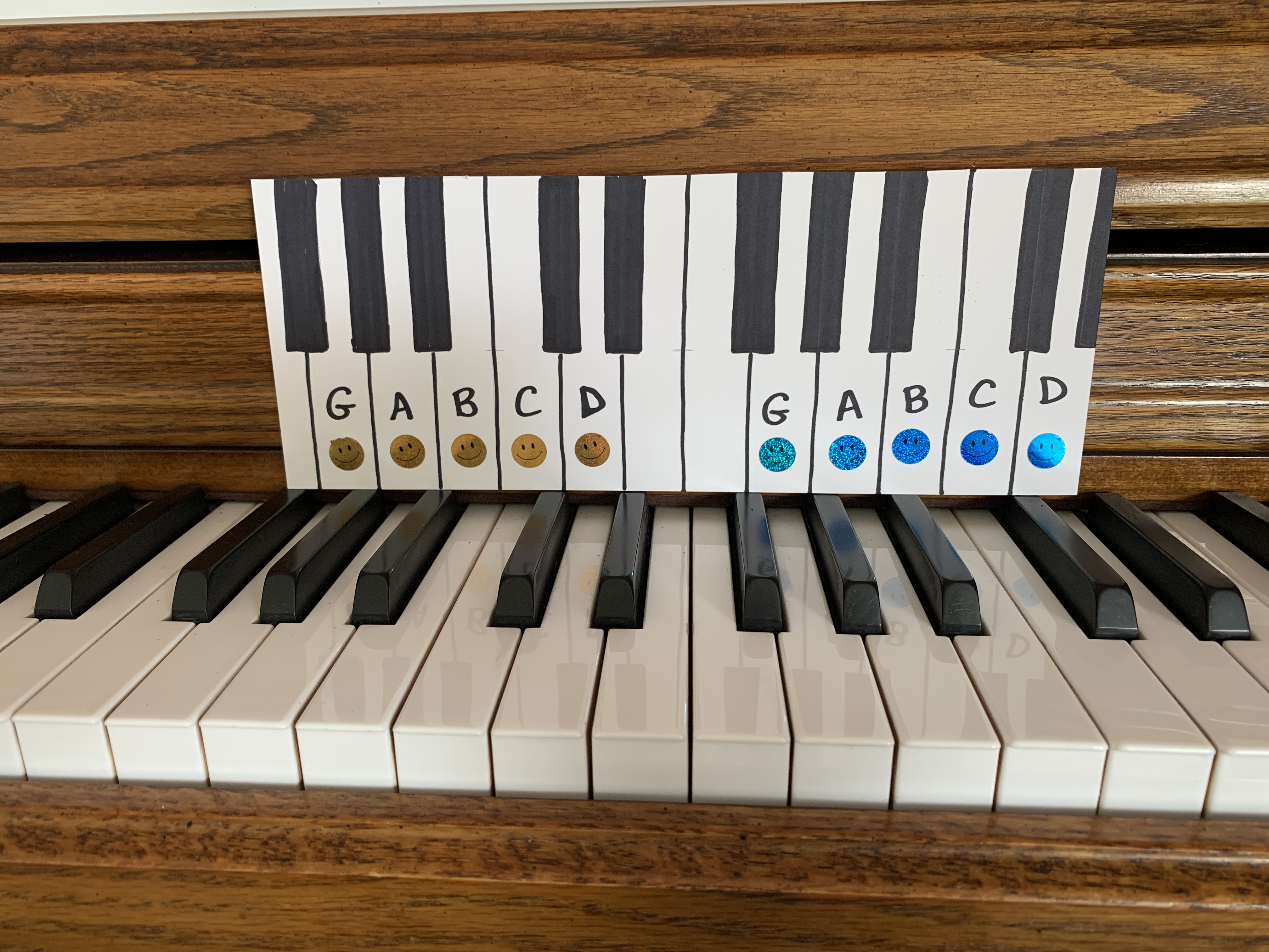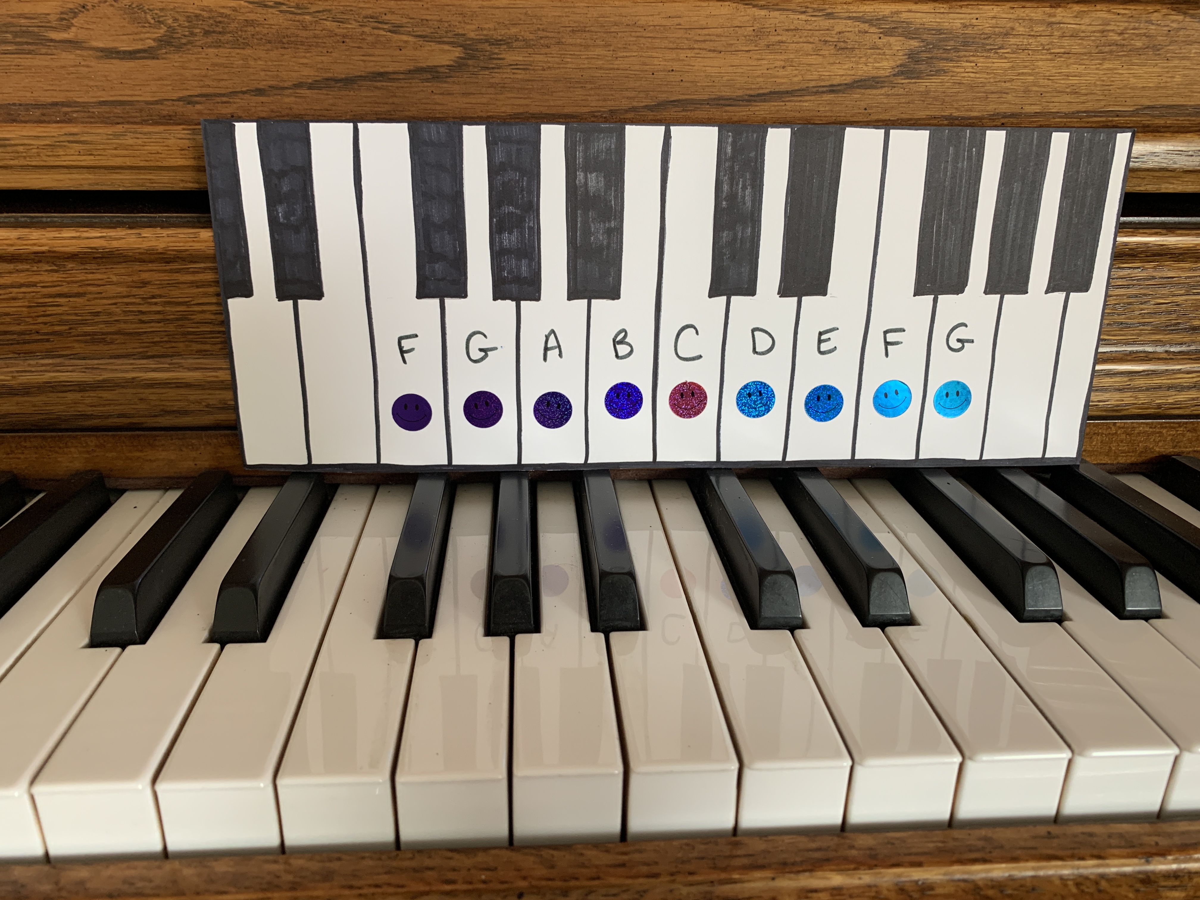 I created the charts to stand behind the keys so you can easily match it up to the correct keys on your personal keyboard at home, as well as the piano in the lesson. Each card shows the letters and their placement on the keys, and I color-code them to distinguish from Right Hand and Left Hand.