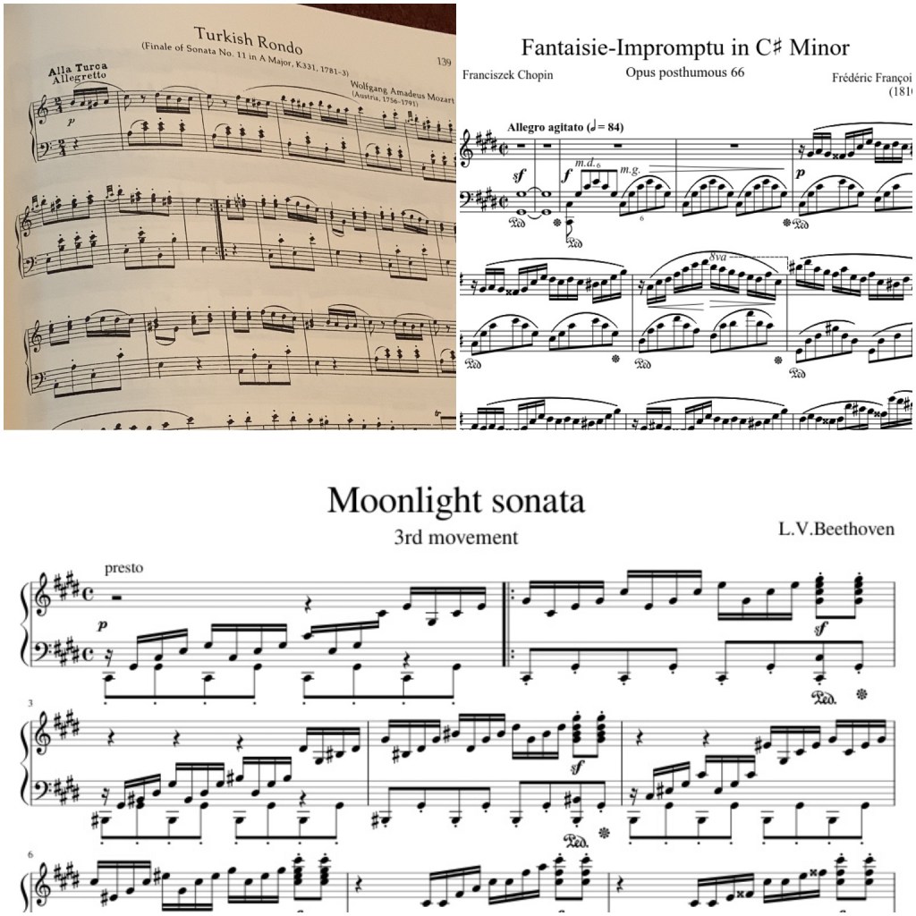 Now, while all the pieces I’ve have mentioned so far are beautiful, they are all slow and a bit sleepy! So I felt I needed to include a faster-paced piece here. How about Mozart’s Alla Turca (aka Turkish Rondo)? Or Chopin’s Fantasie Impromptu? Or Beethoven’s Moonlight Sonata, the 3rd movement? So many great pieces! Here’s a video I highly recommend watching to see some of these faster pieces in action! Its amazing how fast someones fingers can move but it takes a LOT of practice!