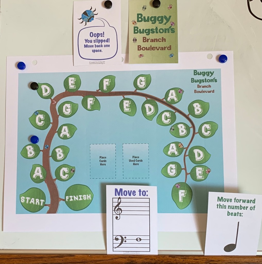 Two more games that are from Nicola Cantan at Vibrant Music Teaching and Colorful Keys, are Branch Boulevard and Jungle Jump. Both of these games review notes on the staff in the treble clef and the bass clef. Jungle Jump focused only on Middle C Position notes, so it works well for Primer level students. Branch Boulevard uses Middle C and regular C positions. With Branch Boulevard some cards even require you to know how many beats a note gets. Both of these games are quick and fun and easy to do with student and teacher or buddy lessons. I got to do Branch Boulevard this week with a pair of brothers that was lots of fun!