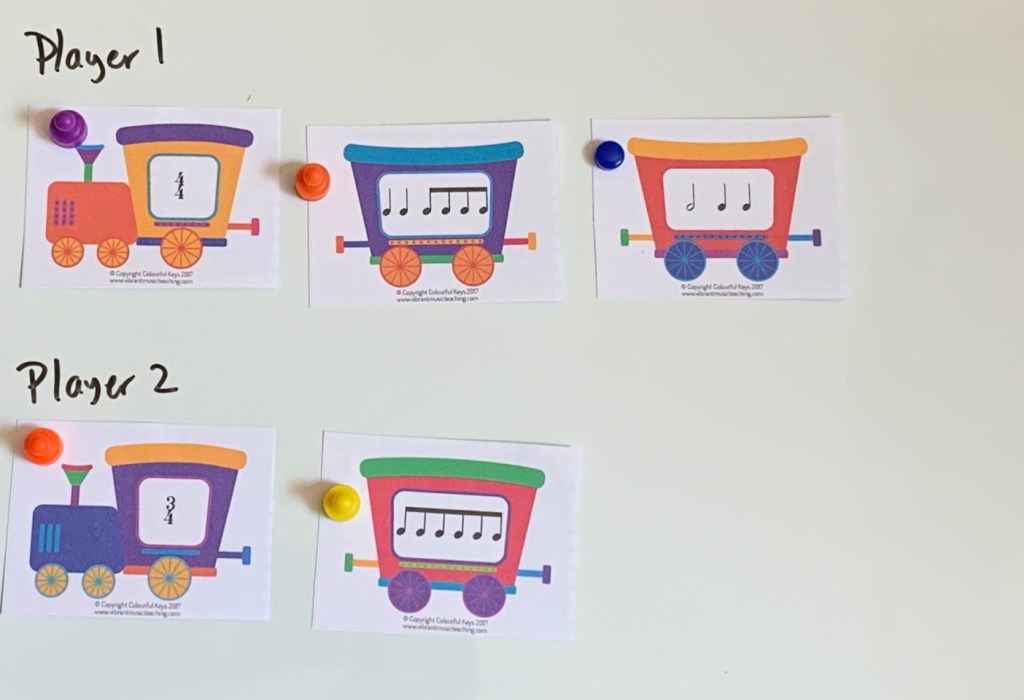 Our 3rd game of the month, which we will start next week, is called Railway Rhythms and I’m excited to try this one, especially with my pair of brother-students. Each player is randomly given a train engine card that has a time signature on it (2/4, 3/4, or 4/4). Then, there is a deck of train car cards that have either a 2-beat, 3-beat, or 4-beat rhythm on them. In the original rules there is supposed to be a discard pile but being online makes that part difficult so we skipped that. Each player takes a turn by choosing a card and clapping the rhythm. Then they must decide if that rhythm fits their train engine time signature or not. If it does, I add it to their engine. If it does not, it goes on the bottom of the deck. The first player to get 4 cars added to their engine, wins the game! The students are not only clapping and counting rhythms but relating it to a specific beat and time.