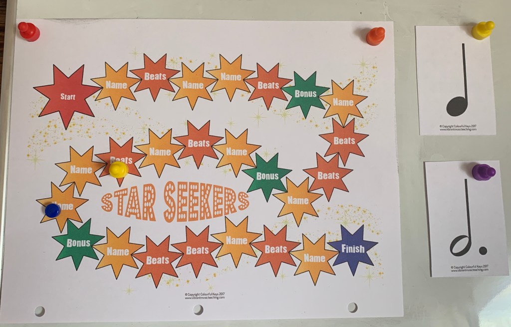 The first game we played is called Rhythm Pass by Nicola Cantan at Vibrant Music Teaching and Colorful Keys. Incidentally all our games in this blog post are by her. She offers lots of great resources for teachers on the VMT site. But Rhythm Pass is a simple game that does not require much preparation. It is a simple sheet with 4 rows of rhythms in different colors and is divided into a number of boxes. In each box is a note or rest and there is one box in each row that is empty.