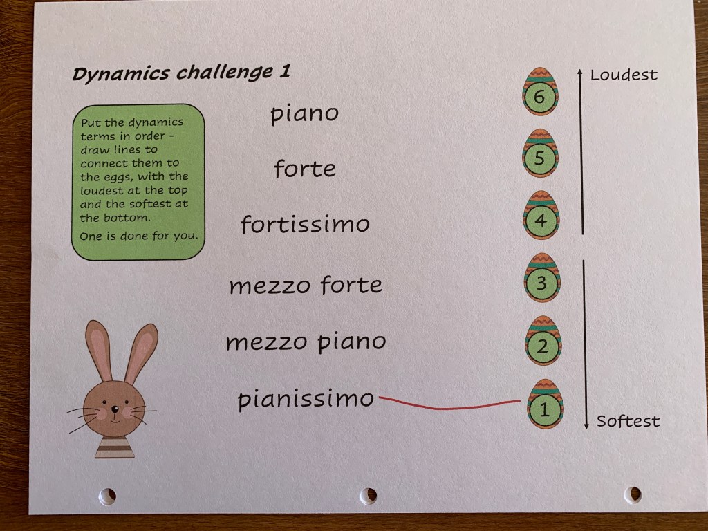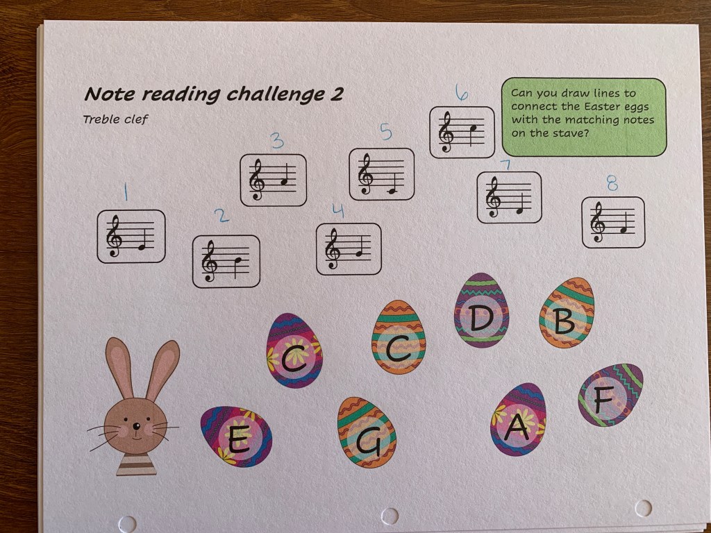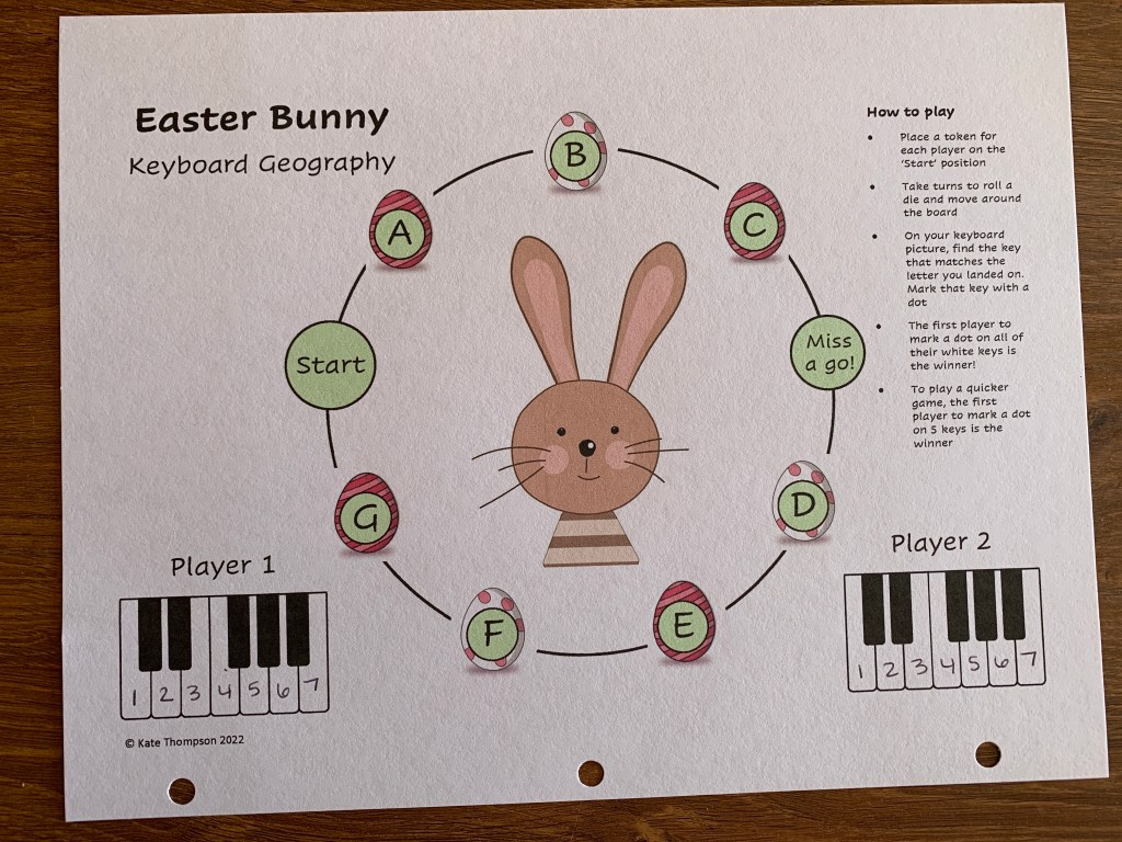 In addition to Kate Thompson’s wonderful activities, I found another cute bunny-themed one on Teachers Pay Teachers. This one comes from Becca’s Music Room. She has so many cute things for kids and teachers! This one was Piano Matching Bunnies. Each bunny comes in 3 pieces that you have to put together like a puzzle. The bunny ears have a letter from the music alphabet, the bunny tummy shows a note on the treble staff, and the bunny bottom shows a key marked on a small keyboard picture. The object is to match all 3 correct pieces to put the bunny back together.