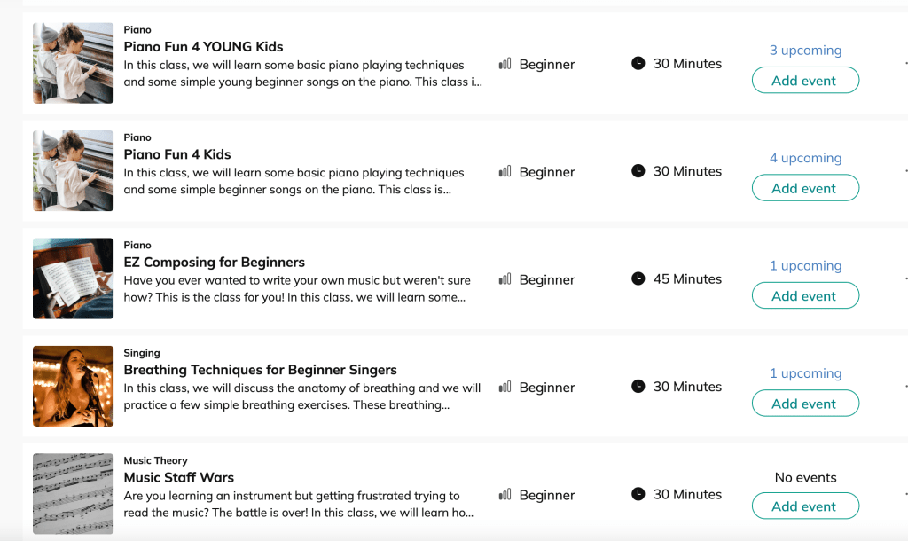 This month I am introducing more classes in all of my subjects. I have more Piano 4 Kids aimed at 7-12 years olds and even a Piano 4 YOUNG Kids aimed at 4-7 year olds. There are adult piano classes like Dozen a Day, where we practice finger exercises. I have more flute classes like Beginner Flute 101 and 40 Little Pieces for flute. I added an Easy Classical Singing class and am trying out a Singing 4 Kids class. I also have several theory classes, some are weekly, like Fundamentals of Theory and others are just scheduled randomly where I have an opening, like Music Staff Wars where we learn about reading the notes on the staff or Dynamic Piano where we learn all about dynamics and playing loud and soft. I even have a class where we learn about composing!