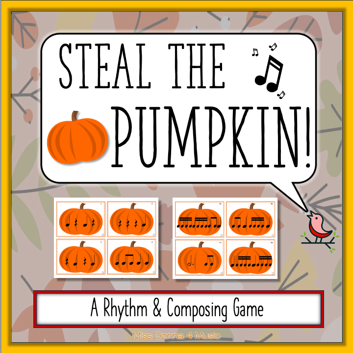 Steal the Pumpkin is a rhythm relay game! Divide your class into 2 teams and print 2 sets of the rhythm cards you want to use. Scatter each set of cards on a table for each team. Play or clap a rhythm from the list and the first person from each team races to find the correct rhythm first. The kids love the competition!