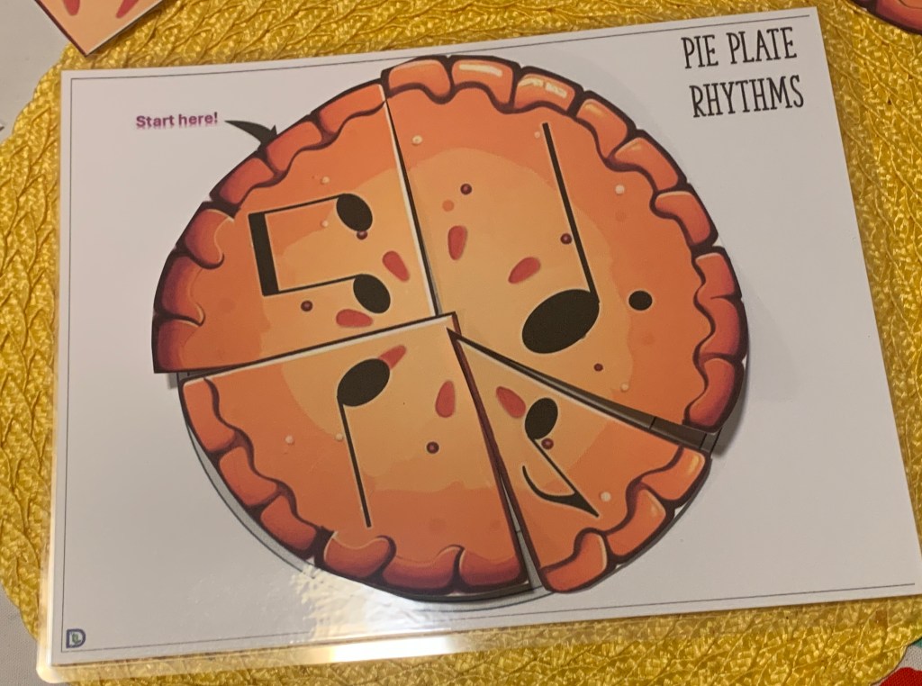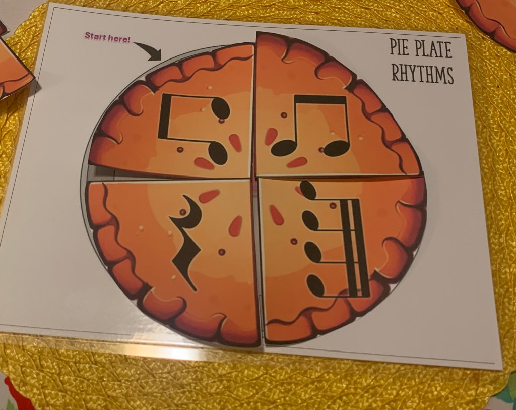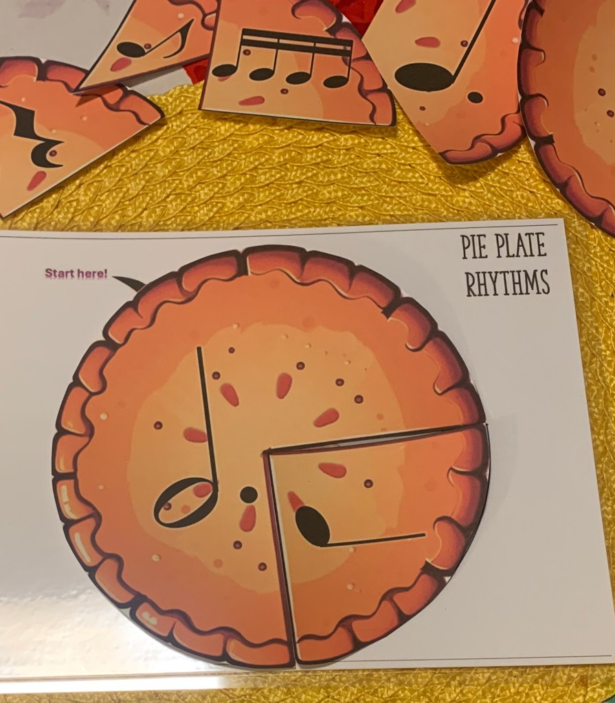 How about some pie a la mode? We used Pick a Piece of Pie and pieced some 4 beat rhythms together in a pie plate to remember how many beats each note type gets and how they all fit together to form a 4-beat measure!