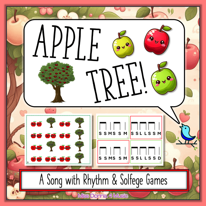 September is synonymous with apple picking, so why not bring that theme into your music classroom? Apple-themed rhythm and solfege games can be both educational and festive. This week I’m using the song “Apple Tree” to reinforce quarter note, eighth note, and quarter rest rhythms and also to practice singing So, Mi, & La solfege patterns. Plus there are a couple worksheets and games to use with K-6 grades. And I have a resource called, Falling Apples, that is a solfege game that also has students recognize where the solfege syllables belong on the music staff.