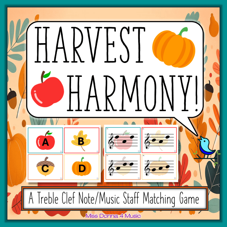 I just posted a new resource in my TPT shop that is perfect for this time of year: Harvest Harmony Note Matching Game! Students match the music alphabet letters to notes on the treble clef staff with cute apples, pumpkins, acorns, and fall leaves. And even some wild mushrooms!