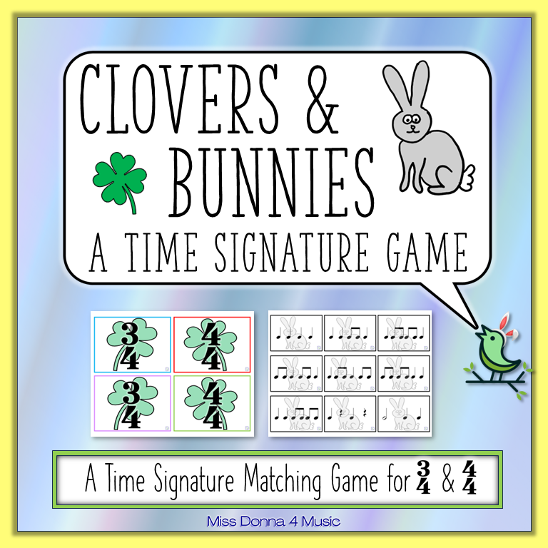 Clovers and Bunnies! This is a fun little activity to practice recognizing rhythms in 3/4 time or 4/4 time! Students will match the bunny rhythm to the correct clover time signature! And there’s a composing worksheet for students to create their own rhythm patterns, then clap or play on instruments.