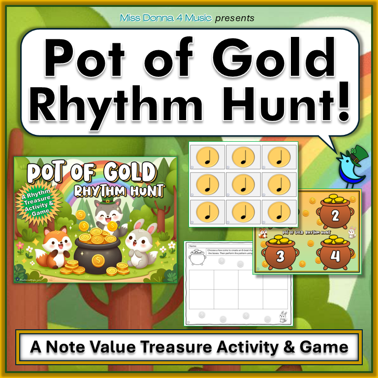 Pot of Gold Rhythm Hunt! This one we’ll do next week and focuses on rhythms and note values. And there are 3 ways to use this resource