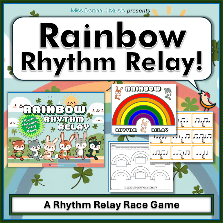 Rainbow Rhythm Relay! I actually tried this one out in a couple classes last week and it went really well! I divided the class into 2 teams. Each team gets a blank rainbow with rainbow color strips cut out. There is a 3-color rainbow and a 6-color rainbow available depending on how long or short you want the game to go. On the other side of the room each team had a set of rainbow rhythm cards to match the colors of their rainbow. I choose a rhythm pattern to play for them and one person from each team runs across to try to find that rhythm. If they find the correct rhythms they get to add that rainbow color from the rhythm card to their rainbow. So as the game goes on, they have to pay attention to what colors they already have in their rainbow and what color the rhythm card is they pick up.