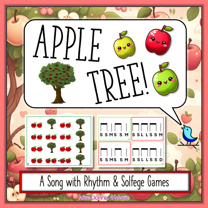 Most music teachers are very familiar with the Apple Tree song. The rhythm focuses on quarter notes and eighth notes but you can also practice steady beat. The solfege of the melody focuses mostly on Mi, So, & La but its also a great way to introduce Do too!