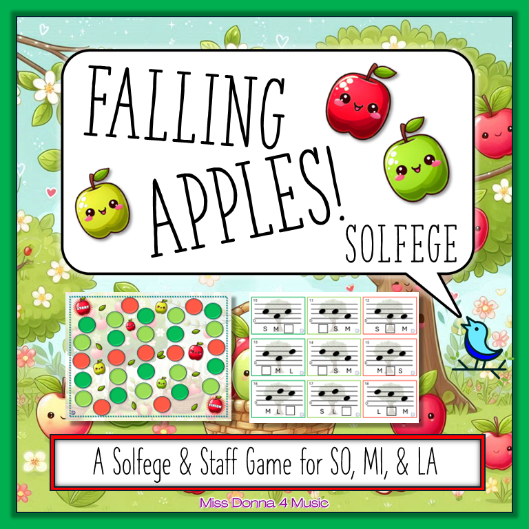 Another apple themed game, Falling Apples, is a solfege board game where students can practice So, Mi, La patterns and recognizing them on a staff. Students are practicing how to find and recognize where So, Mi, and La sit on a staff and advance around the game board. This can be used with a whole class divided into teams or in small groups or centers. I love this as a centers game!
