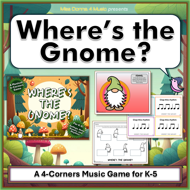 In the meantime, check out the coordinating resource called Where’s the Gnome?! A fun 4 Corners game designed for K-5 students to move, sing, read rhythms, and practice solfège and staff notes. It features 8 colorful gnome posters with names and bios, and three ways to play, so you can differentiate for varying levels. This game pairs nicely with Where’s the Mushroom? in terms of structure, learning goals, and fall themes.