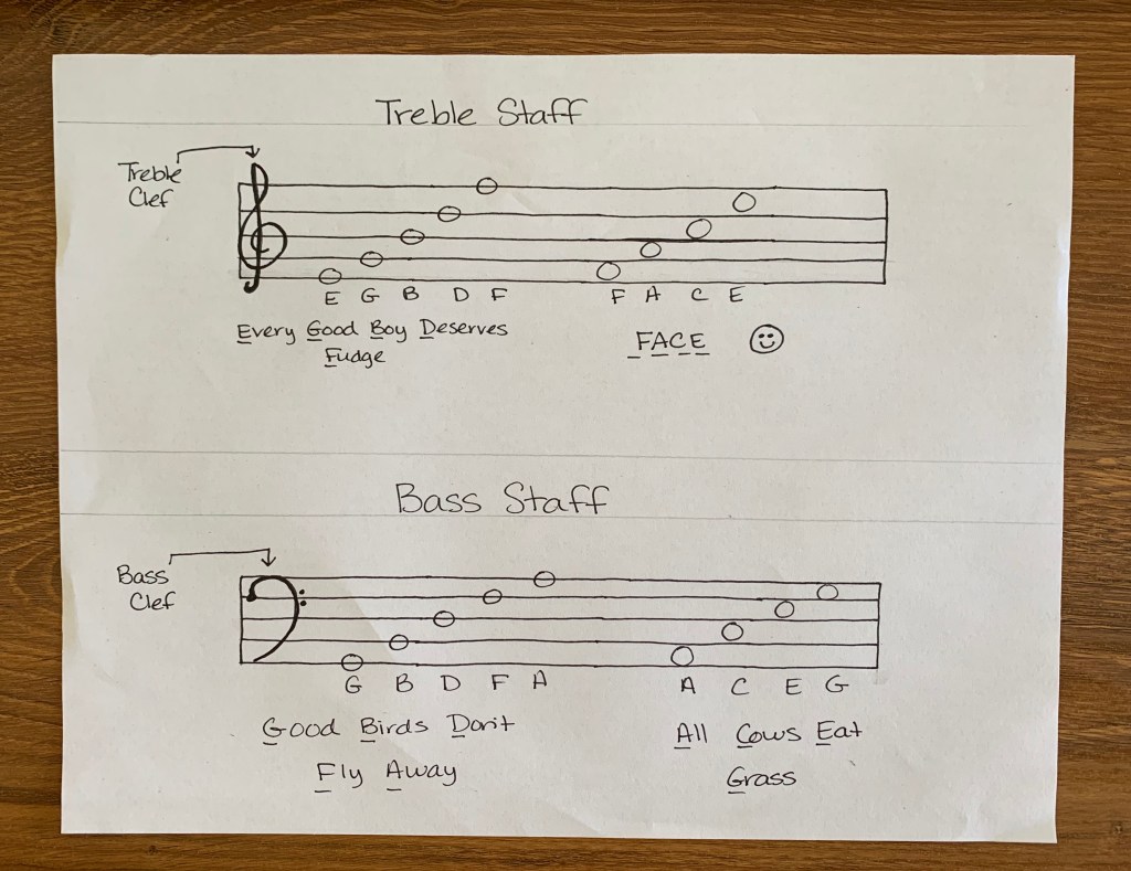 When I have a new student that has never learned any kind of music at all, I like to go over a few basic things about reading music. For most of my piano and flute students, they either have a theory book along with their other lesson materials or they have learned a little bit…